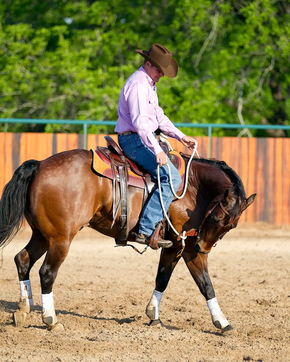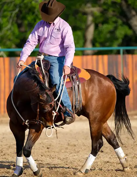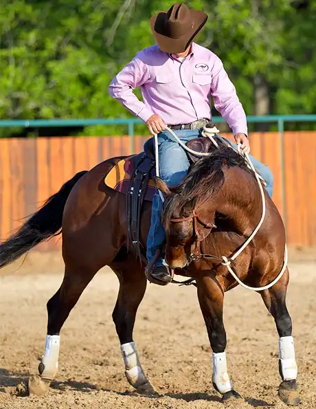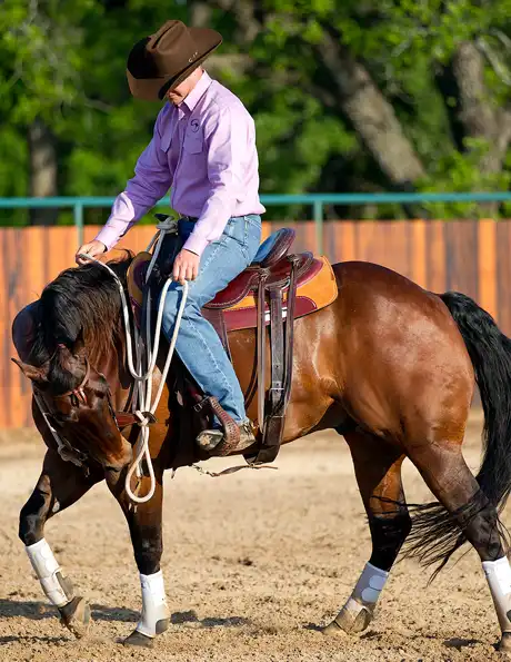 2. To bend the horse to the left, slide your left hand down the rein and pull it up to your hip. At the same time, roll your inside spur to soften his ribcage. Remember that your inside hand and inside leg go on together and off together.