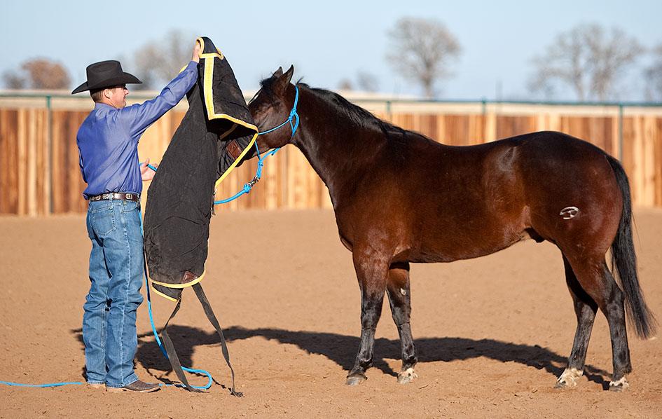 Desensitize your horse to the blanket when he wants to stand still—after you have worked him and he’s using the thinking side of his brain. Don’t take a horse that has been in a stall for a couple of days and is full of beans and try to desensitize him to the blanket. He’ll run around and not want any part of standing still. Set yourself up for success and desensitize your horse when he’s tired and wanting to stand still. If you just do desensitizing without having the horse’s respect and attention from groundwork, all the information you give him won’t last. It’ll go in one ear and out the other. The secret is to desensitize a horse between groundwork exercises. That way, he looks forward to being desensitized because he gets to air up and relax.