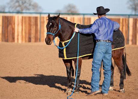 2. Since you may have to loop the blanket over the horse’s head, depending on the style of blanket you have, it’s also a good idea to double-check that he’s OK with objects moving around his face. You can use the Fundamentals Head Shy Exercises for this.