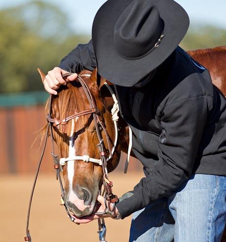 Step 7: Once the bridle is on, rub the colt’s face and adjust the headstall so that the bit is just sitting in the corners of the colt’s mouth.