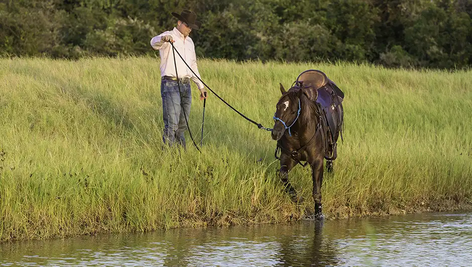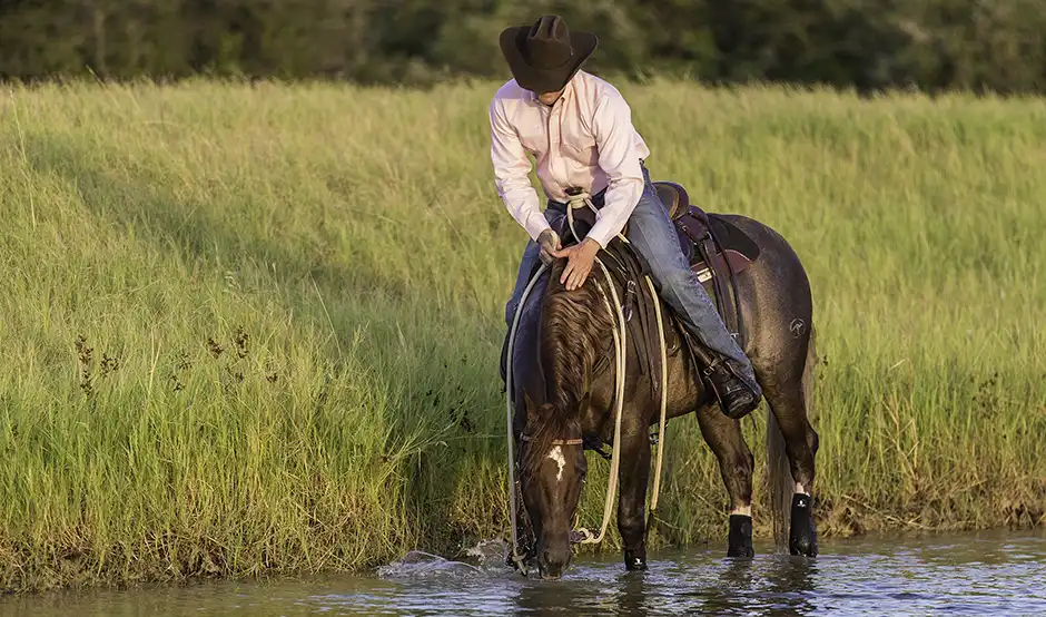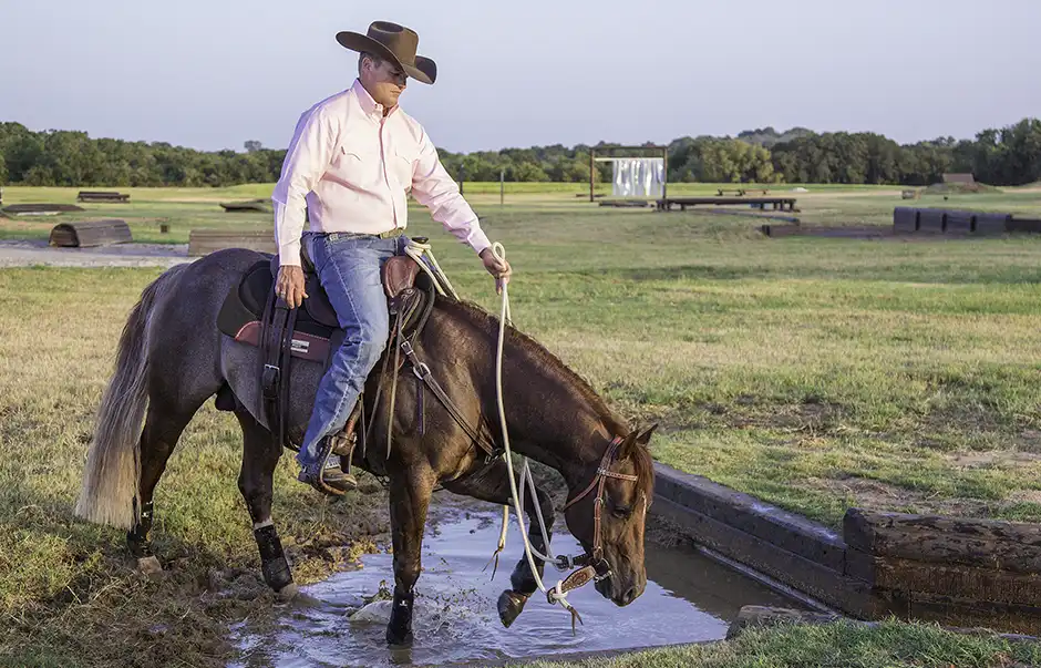 The key to teaching your horse to navigate any obstacle, including water, is to give him enough practice so that he gains confidence. Go over a stream or through a pond a hundred times. Go over it again and again, from different angles, at different speeds, and from all sides. At the ranch, we end every horse’s training session by putting him on a big, loose rein and letting him walk in the shallow perimeter of one of the ponds on the property. At that point in the ride, the horse is sweaty and he’s a little tired. Splashing through water doesn’t sound like a bad deal to him. If the horse wants to stop and drink water, we let him. If he wants to stop and stand for a few minutes, we let him. We rub on him and don’t make him feel wrong for relaxing. We make the pond seem like the best part of the ride for the horse, and it doesn’t take long for him to look forward to getting his feet wet.
