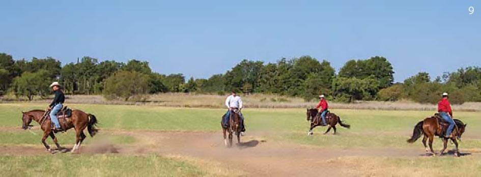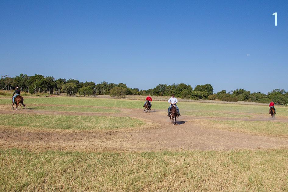 1. In this exercise, a group of riders will lope their horses in a cloverleaf pattern, with each rider doing his own separate pattern so traffic is going in both directions. In order for the exercise to have the most effect on the horses, you need at least three horse-and-rider combinations participating.