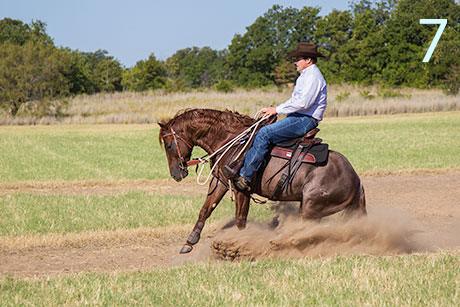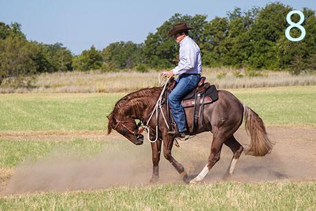 7 & 8. At the 10-minute mark, riders can stop their horses. I like to stop my horse in the middle of the pattern, because it helps to increase his draw to the middle, which will increase his responsiveness in the turns and make his lines straighter. Ride your horse a little past the halfway point and then draw him to a stop and back him up to the middle.