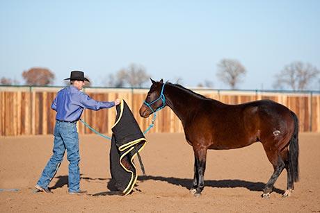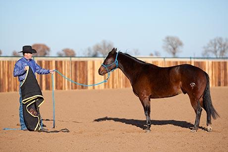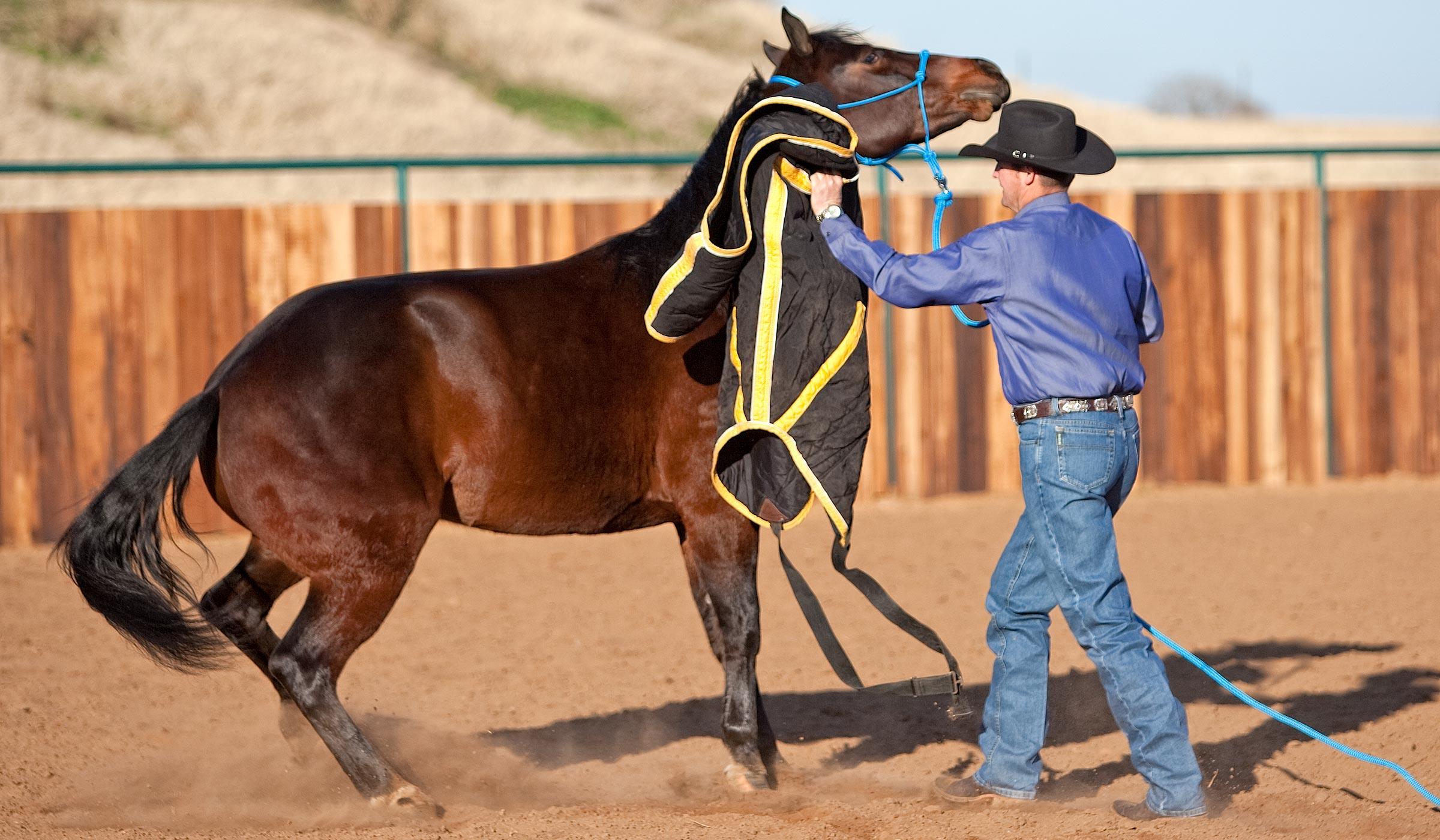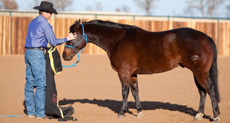 The majority of people quit desensitizing far too early. Instead of remaining patient and working through resistance, they give up. Getting aggressive with the horse or losing your temper isn’t the answer either. There’s no place for emotion while training.