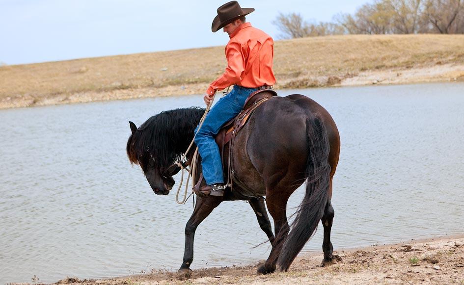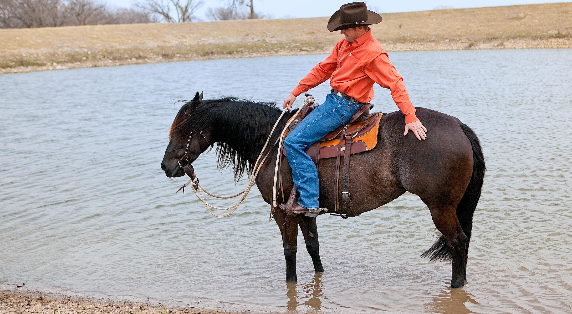 Rather than forcing the horse through the water, you can use the Approach and Retreat Method to make crossing the water his idea. In this example, you would ride the horse toward the water and just before he stopped, you’d stop him and retreat (back him away from the water), which is the complete opposite of what the horse thinks you’re going to do. He thinks you’re going to force him to step in the water, but rather than forcing him toward the scary object, you’re backing him away from it. It’s kind of like a cat and mouse game. The more you say, “Don’t go, don’t go,” the more the horse wants to get closer to the water. You build up his curiosity until eventually, he’s calmly walking through it and using the thinking side of his brain.