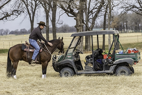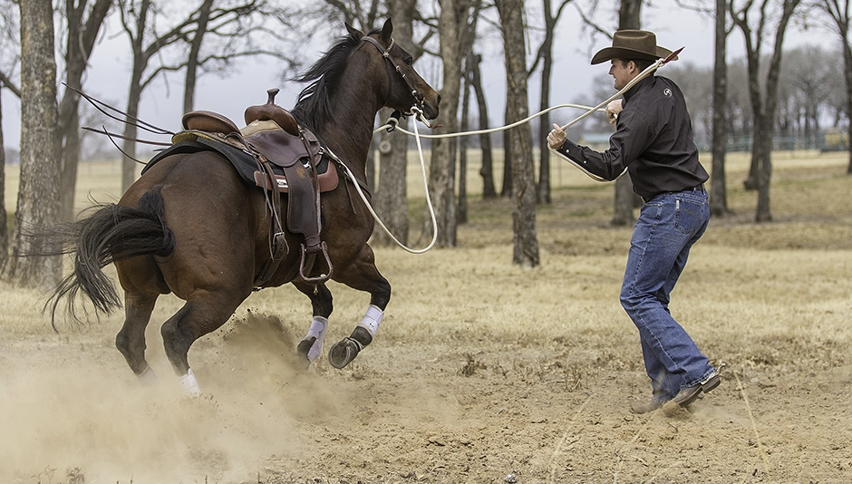Then, before you get back in the saddle, doublecheck his “go” button by practicing some Lunging for Respect Stage Two. As soon as you point with your hand to tell the horse to move, he should hustle his feet out onto the circle. If he doesn’t, use the end of your mecate to make him feel uncomfortable for ignoring you. A good rule of thumb to remember is if your horse has an attitude about moving forward when you work with him on the ground, or he’s lazy, his response is only going to get worse under saddle.