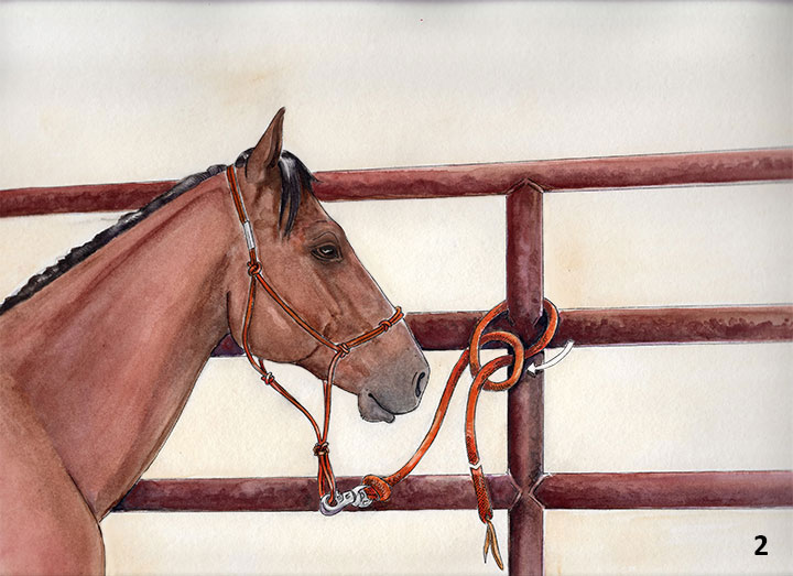 Tighten the knot by pulling on the free end while holding the line attached to the horse.